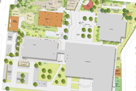 Durch die integrierende Gestaltung des Schulhofes soll die Interaktion der Schülerinnen und Schüler gefördert werden. Es entstehen Orte für gemeinsame Pausen sowie für Kommunikation und Spiel als auch Rückzugsräume. Das Highlight: eine speziell auf die Bedürfnisse der Altersgruppen entwickelte Boulderwand und weitere Spiel- und Calisthenicsgeräte. Eine große neu angelegte Sportanlage ermöglicht den Schulsport draußen, kann aber auch in den Pausen bespielt werden.