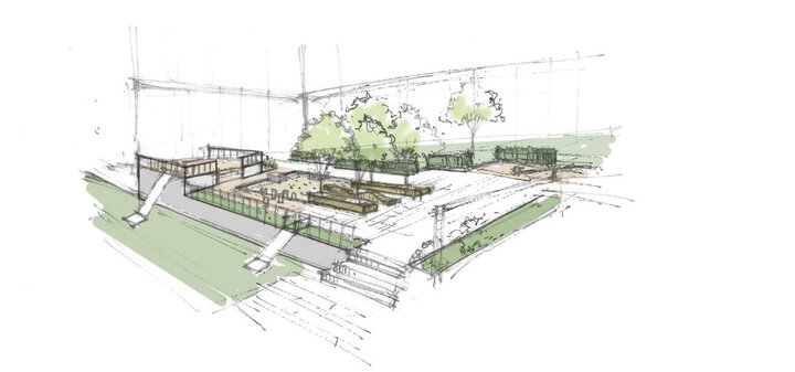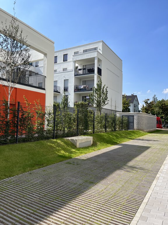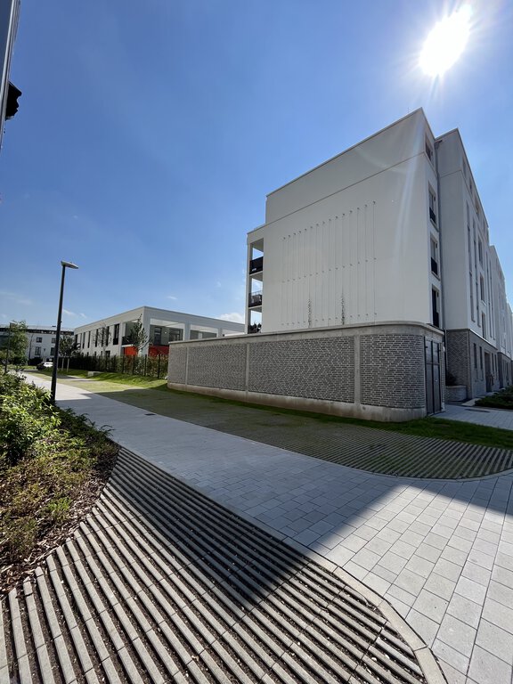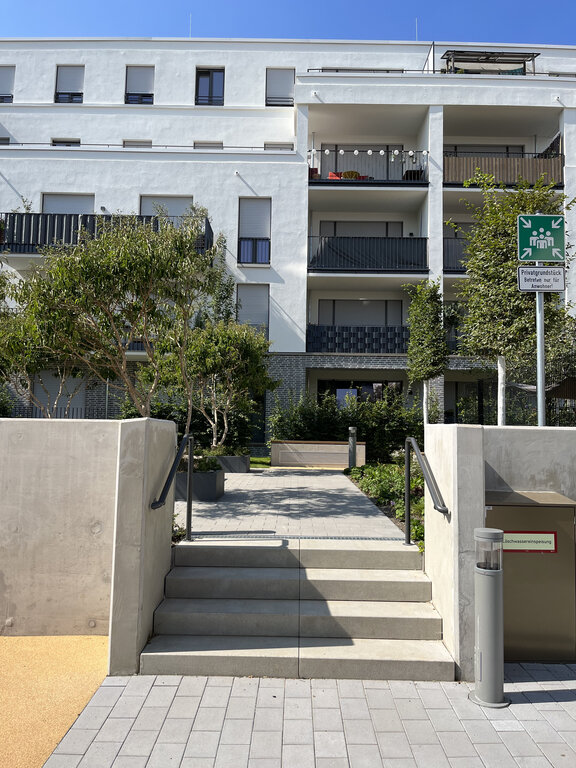 Das Konzept der Außenanlagen überträgt in seiner Gestaltung und Wahl der Materialien das Wohngefühl aus dem Innenraum auf die Außenanlage. Da keine Privatgärten vorgesehen sind, gestaltet der Entwurf den Innenhof so attraktiv, dass er als Gemeinschaftsgarten gesehen und angenommen wird. Hier entstehen durch Rasen- und Beetflächen sowie Bänke und Liegeflächen unter Bäumen Orte des Verweilens und der Ruhe.