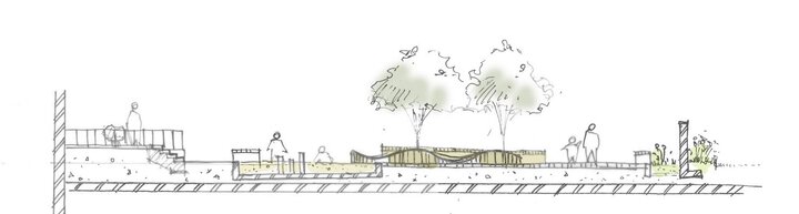 Die Abgrenzung zum KiTa-Bereich wird wahlweise durch eine 1,80 m hohe Sichtbetonmauer oder einen blickdichten Staketenzaun in derselben Höhe ausgeführt. Des Weiteren werden zwischen Innenhof und U3 Bereich 5 Spaliergehölze gepflanzt, die für eine optische, aber auch im Sommer akustische Distanz zwischen Wohnen und KiTa-Spielen sorgen. Die Flächen der Kita sind unterteilt in zwei Bereiche: U3 und Ü3