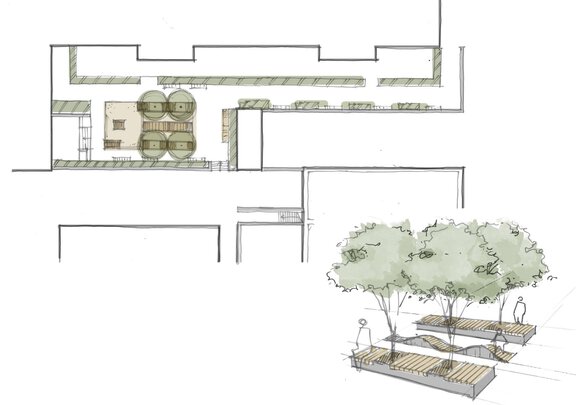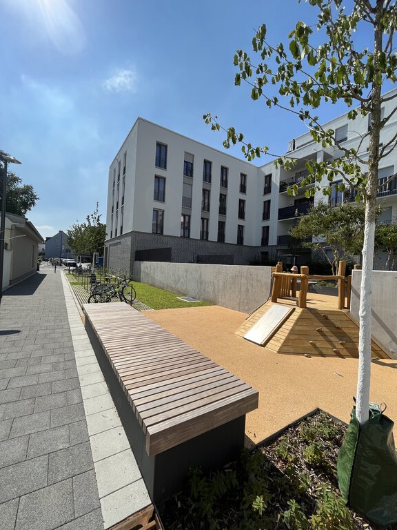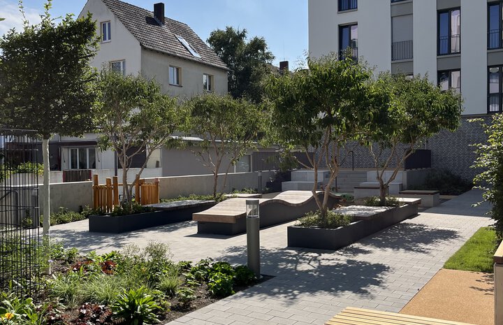 Auf dem kleinen Platz im Innenhof sind Kommunikationsräume unter den schützenden Kronen von vier Bäumen Bänke angeordnet. Die Bänke sind zum Teil so großzügig angeordnet, dass man darauf liegen oder zu mehreren in ein Gespräch vertieft sitzen kann. Eine Balancierebene und ein Sandkasten mit einigen weiteren Spielangeboten bieten derweil den Kindern genügend Spielraum.