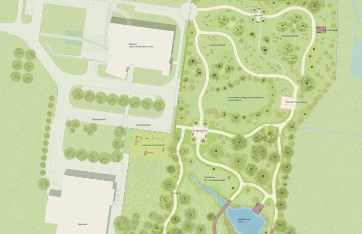 Der Garten soll jedoch nicht nur Wissen zur Dendrologie (Gehölzkunde) und dem Thema Naturschutz vermitteln, er bekommt durch die Anlage von kleinen Plätzen mit Sitzbänken, einem Holzsteg über den Teich und seinem beschilderten Wegenetz und der schönen Lage am Ortsrand von Oberanven auch eine hohe Aufenthaltsqualität.