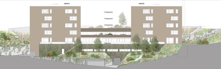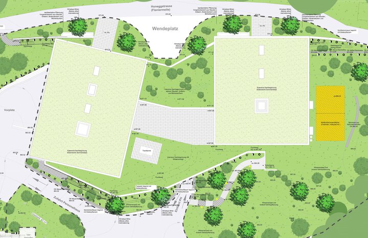 Ein Energieversorgungszentrum im südlichen Bereich des Geländes wurde ebenfalls in den Hang gebaut. Die Integration des Gebäudes in den Hang verhindert eine Störung des Landschaftsbildes. Ein Garten mit einer Multifunktionsfläche und mehreren Sitzmöglichkeiten, eingerahmt von einer Wiese mit einer lockeren Gehölzpflanzung, schafft Orte der Ruhe, des Rückzugs und des Aufenthalts, aber auch Aktionsräume die zur Bewegung motivieren.