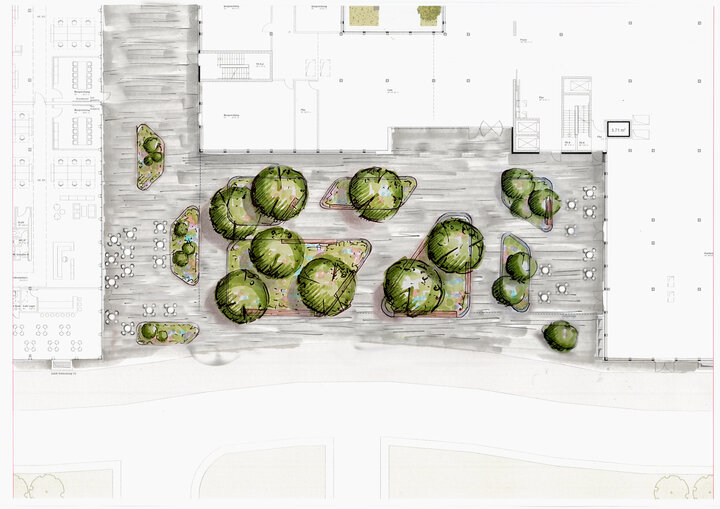 Ein repräsentativer Bereich aus verschiedenen Pflanzinseln in Form von Hochbeeten bildet den Mittelpunkt der Fläche. Großzügige Sitzflächen auf den Hochbeet-Einfassungen laden in den Pausen für Aufenthalt ein; es entsteht ein Kommunikationsraum mit hohem Aufenthaltswert für den gemeinsamen Austausch in angenehmer Atmosphäre.