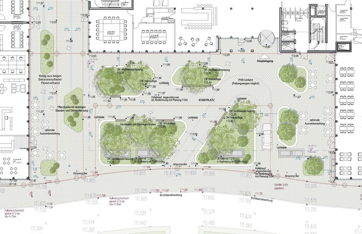 Der repräsentative Vorplatz des neuen Siemens Standorts bildet im Zusammenhang mit dem Vorplatz des Element Hotels, westlich die De-Saint-Exupéry Straße, einen zentralen Stadtplatz innerhalb der Gateway Gardens . Um den Platzcharakter und die optische Zusammengehörigkeit zu unterstreichen, ist die Auswahl der Materialen und die Ausstattung auf den Hotelvorplatz abgestimmt.