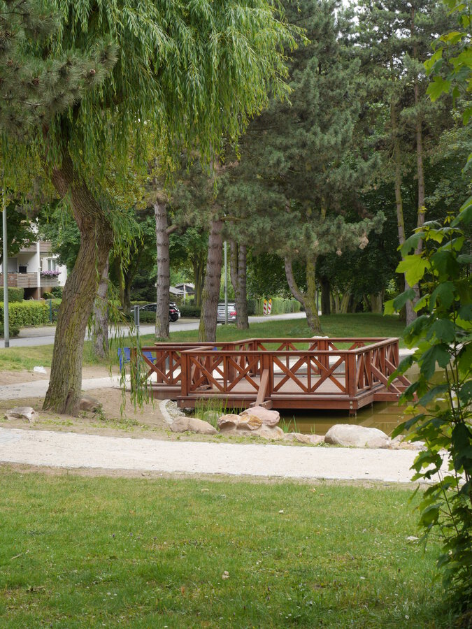 Das organische Material wurde aus den Teichbecken entfernt, die Uferzonen revitalisiert und ein Überlauf zwischen den Teichen angelegt. Zudem wurden Multifunktionsflächen zum Spielen, Sitzen und Ausruhen angelegt. Die Sanierung der Wegeflächen erfolgte mit einer wassergebundener Wegedecke und einer Einfassung aus Natursteingroßpflaster. Die vergreisten Sträucher wurden aus der Parkanlage entfernt und durch Neupflanzungen ersetzt.