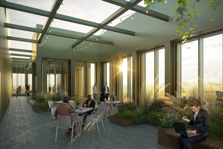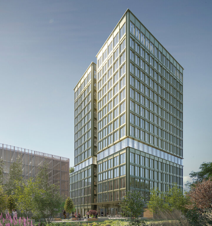In Eschborn entsteht ein Office Tower in einzigartiger Holz-Hybrid Bauweise, der neben seiner spannenden und nachhaltigen Architektur auch über verschiedene Außenräume verfügt. Neben den weitläufigen Freiflächen im EG, mit ihren vielen verschiedenen Aufenthaltsmöglichkeiten, verfügt das 15 geschossige Gebäude über vier verschiedene Dachterrassen auf unterschiedlichen Stockwerken. Hier ist viel Platz für entspannte Pausen, Arbeiten im Grünen und einen Sundowner mit Blick auf die Skyline. Außerdem sorgt eine vielfältige Bepflanzung mit größtenteils heimischen und insektenfreundlichen Arten für eine hohe Biodiversität auf den Dächern. Sämtlicher Niederschlag, der auf den Dachterrassen anfällt, wird in Retentionsboxen zurückgehalten und den Pflanzen zur Verfügung gestellt. Somit wird ein hohes Maß an anfallendem Regenwasser im natürlichen Kreislauf gehalten, und das Mikroklima im städtischen Umfeld verbessert. Auch das vollflächig begrünte Solardach der zum Tower gehörenden Hochgarage, leistet seinen Beitrag zum nachhaltigen Konzept der Anlage.