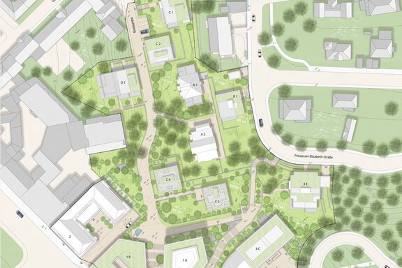 Die Platzfläche schließt an die Ost- und Südfassade des Neubaus an und kann zur Aufstellung von entsprechender Außenbestuhlung genutzt werden. Entlang der Südfassade soll eine Holzbank das Sitzplatzangebot ergänzen. Den Abschluss der Fläche im Norden bildet eine Pflanzfläche, welche intensiv mit Sträuchern sowie Stauden, Gräsern und Bodendeckern bepflanzt wird.