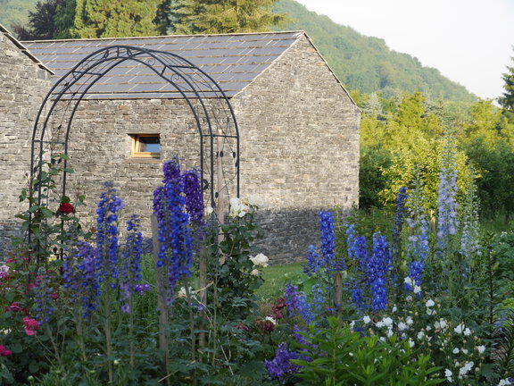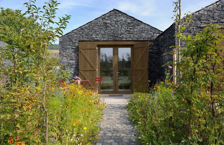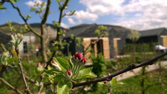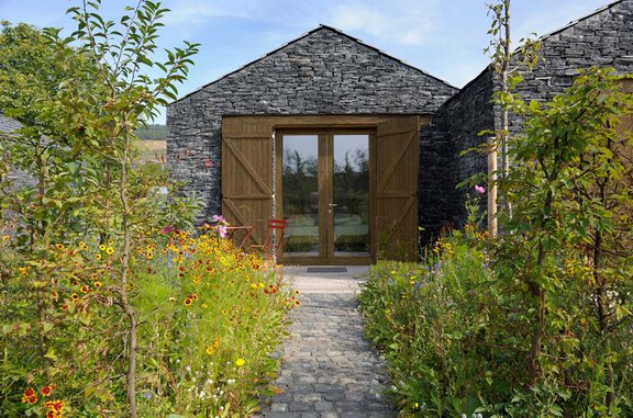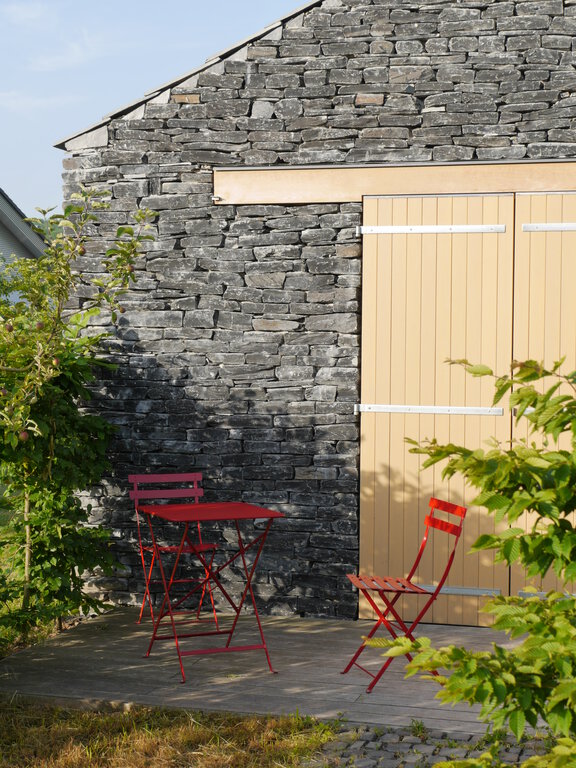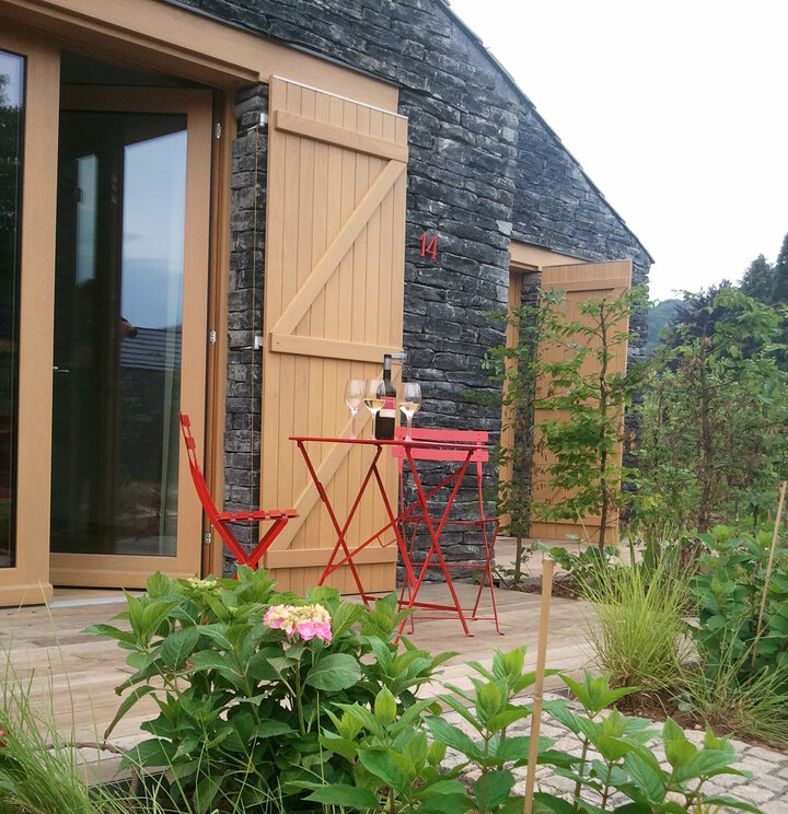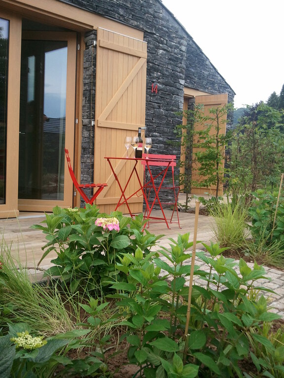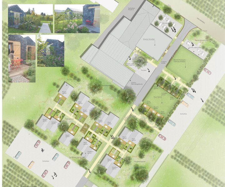 Im direkten Anschluss an die Gästehäuser befinden sich, den einzelnen Unterkünften zugeordnet und individuell gestaltete, Gartenräume. Diese können durch die Gäste genutzt werden. Es sind fünf unterschiedlich ausgeprägte Gästegärten vorhanden, die durch eine identische Größe und einen modularen Aufbau den einzelnen Gebäuden gemischt zugeordnet sind und ein spannungsvolles und abwechslungsreiches Gestaltungsbild ergeben.